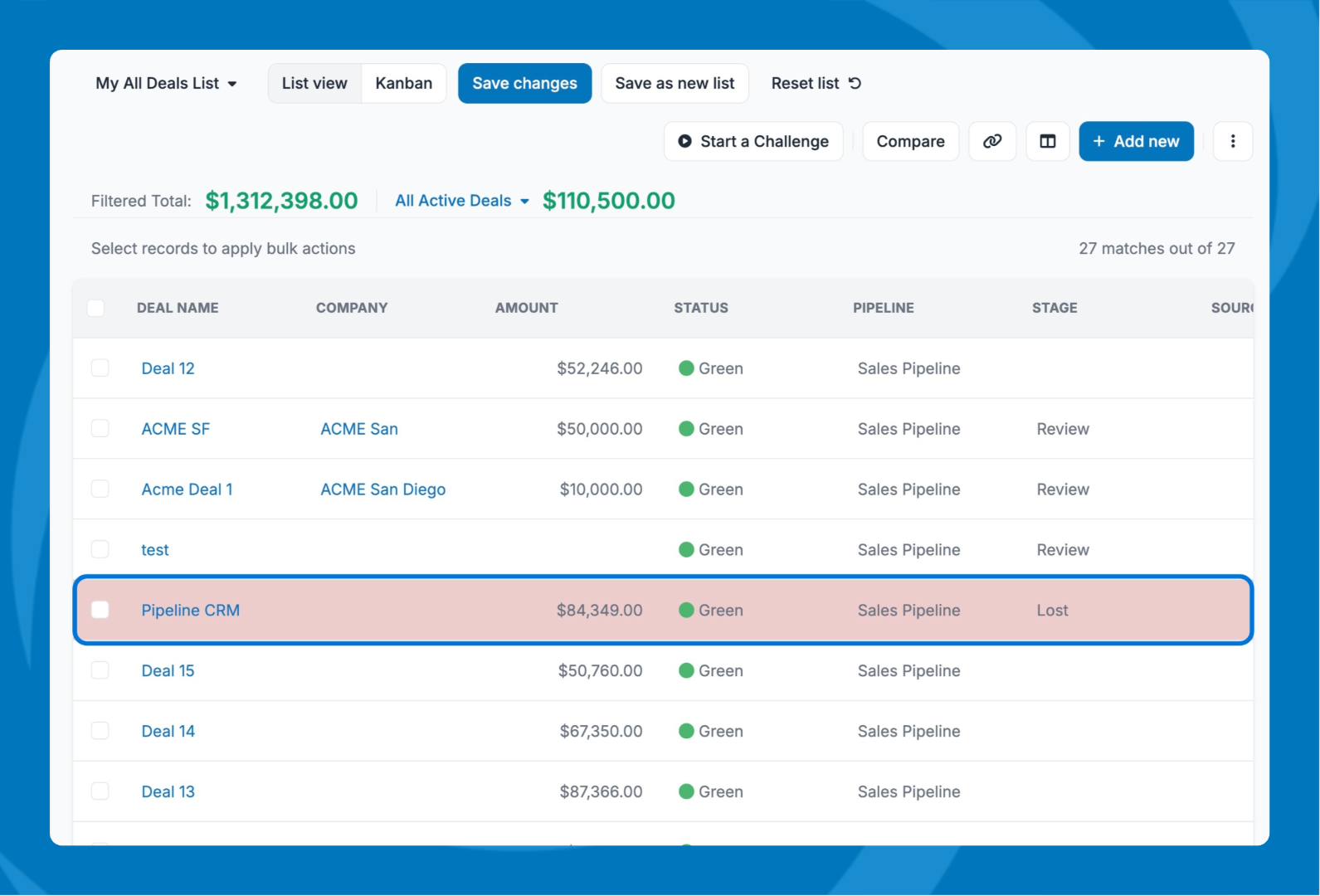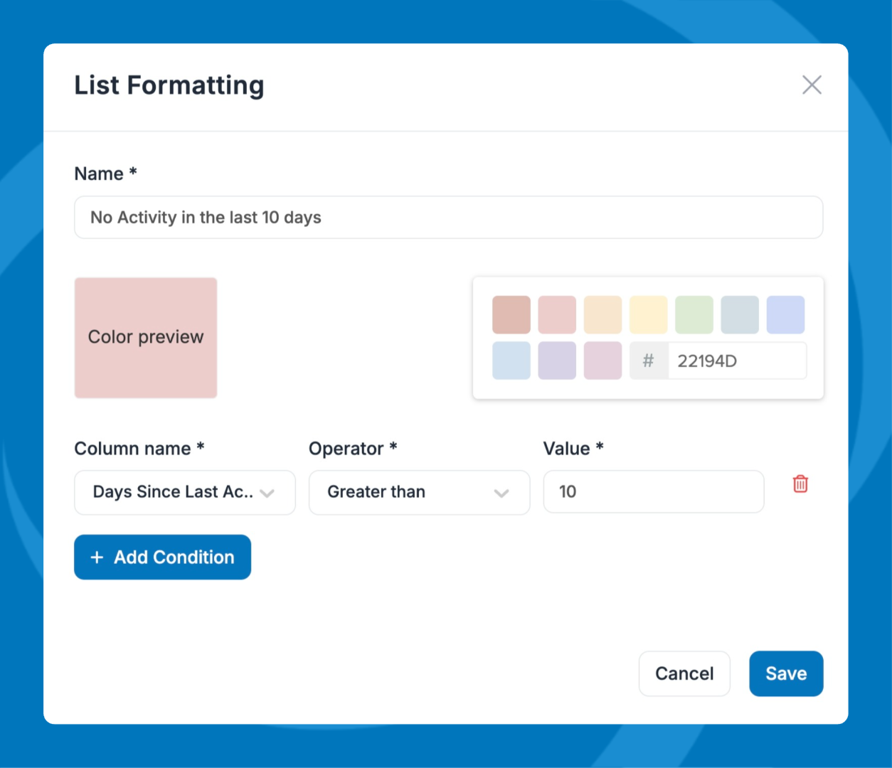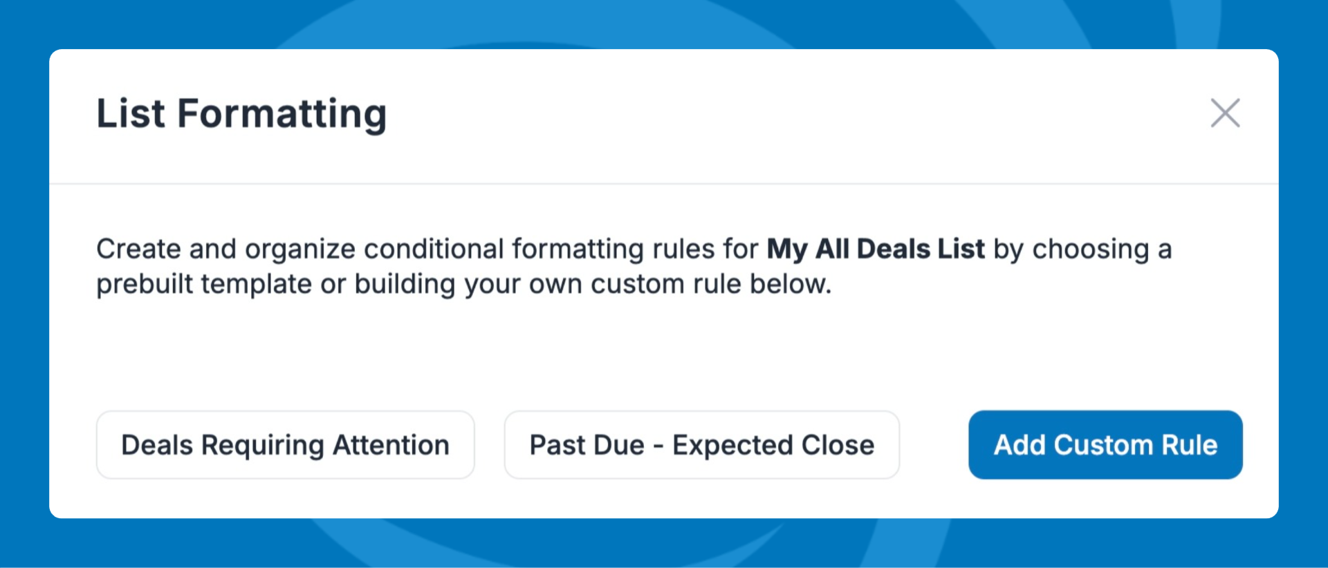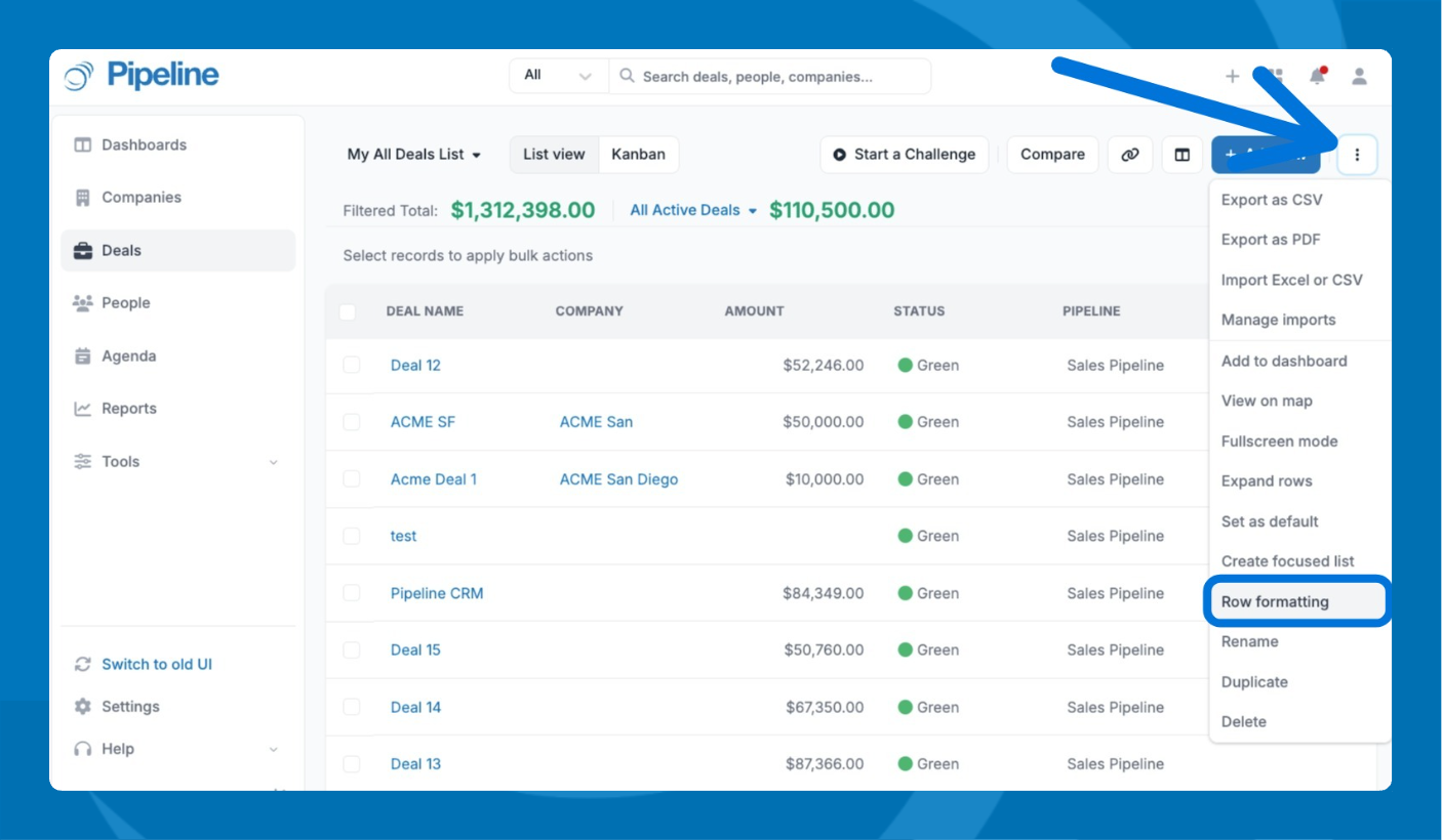 - You cannot add row formatting to All Companies, All Deals, or All People lists.