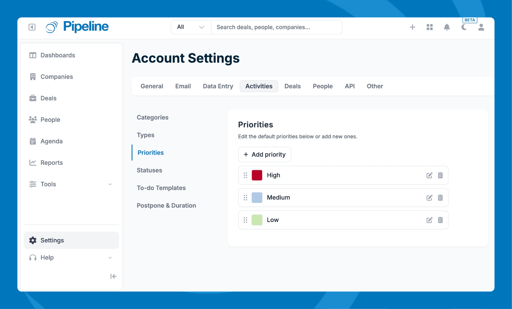 Admins can rename, color-code, add, remove, and reorder priorities.