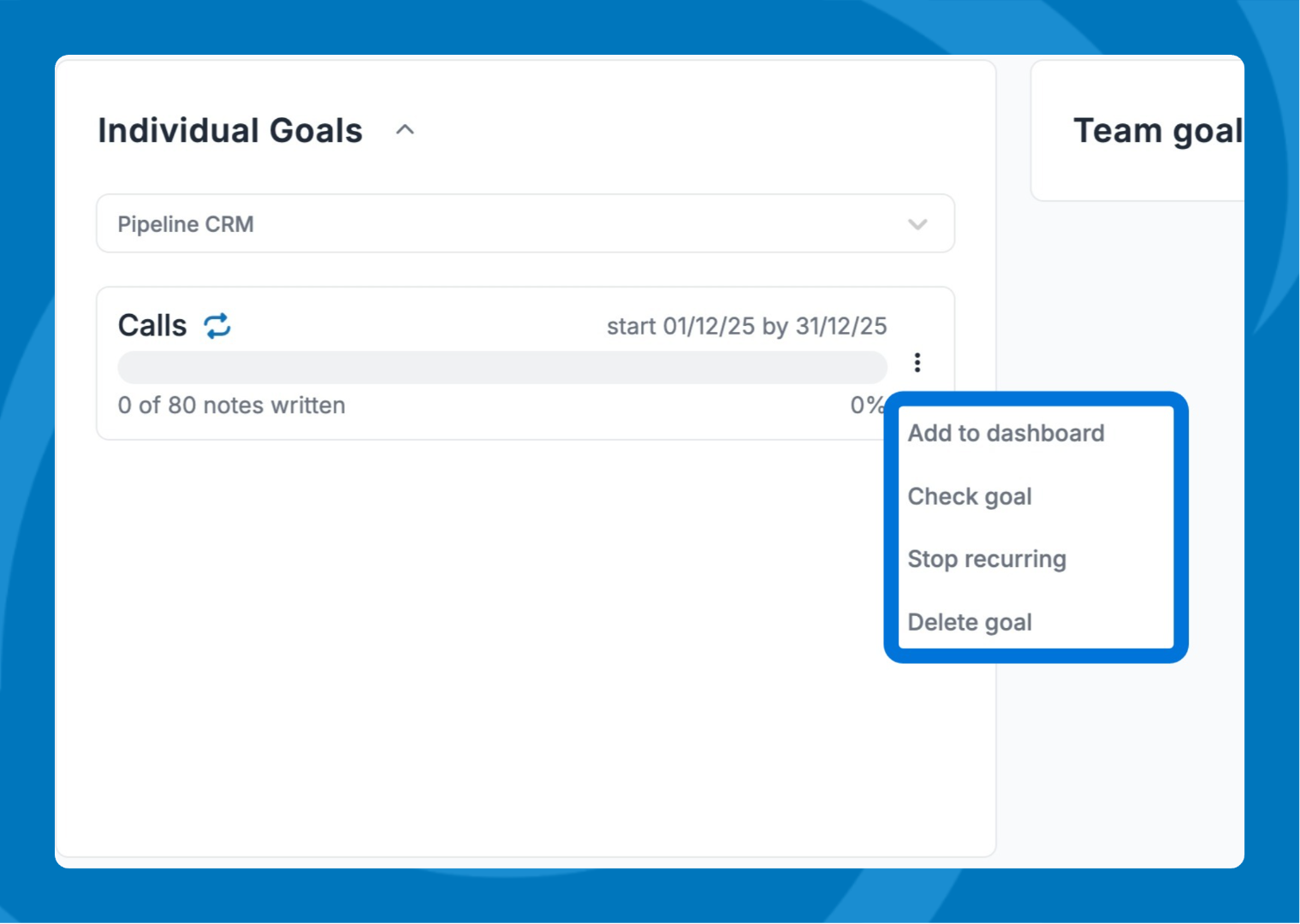 - Goals only appear on the Leaderboard tile if more than one user (such as a team) is assigned to the goal.