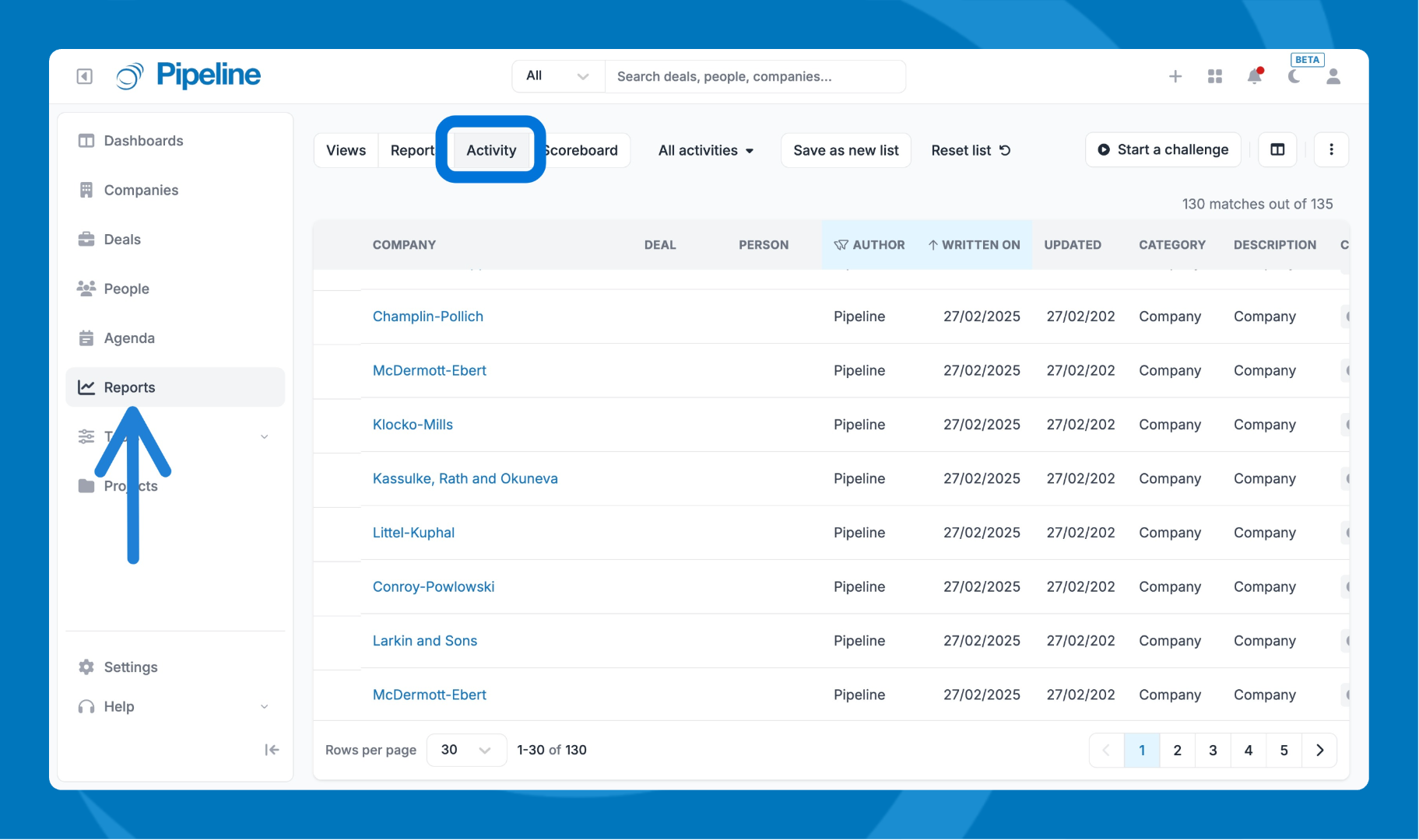 - Activity type: Category, like Deal, Company, Instant Doc, Trackable Email Action, etc.