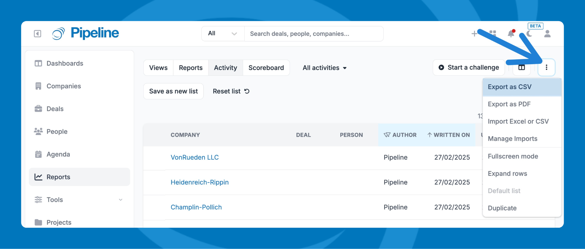 Need to analyze activities outside Pipeline CRM? You can export the Activity Report to a CSV file for use in spreadsheets or other tools.