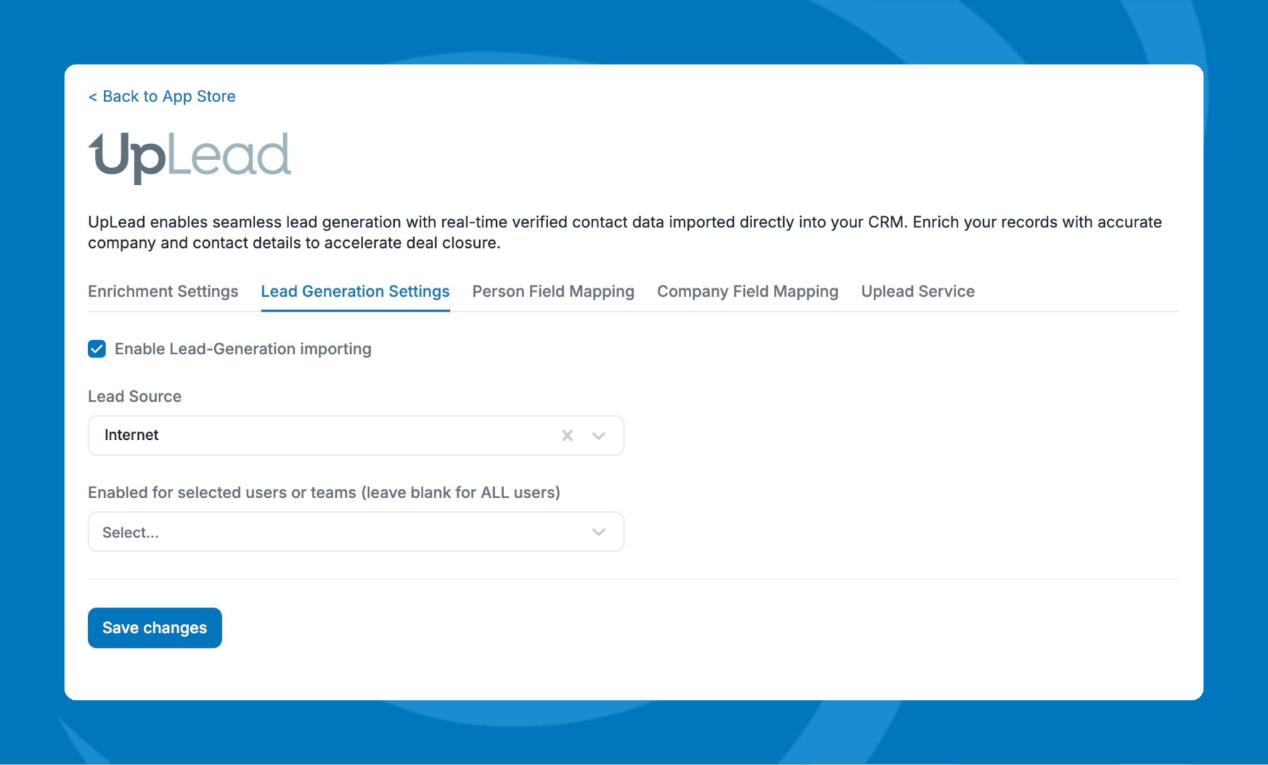 - Choose the users and/or teams that will be able to use lead generation. Leave this blank to allow all users.