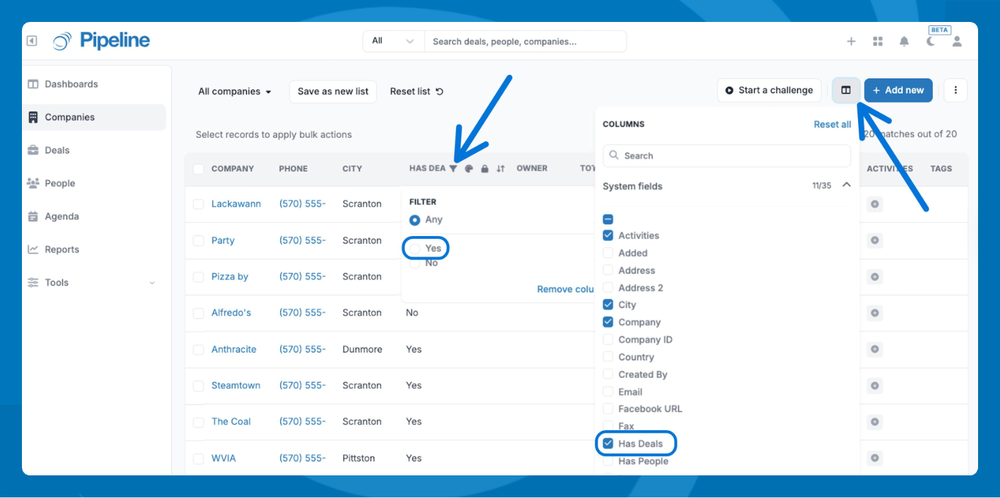 - Add the Has Deals column to your list view by clicking the Columns icon.