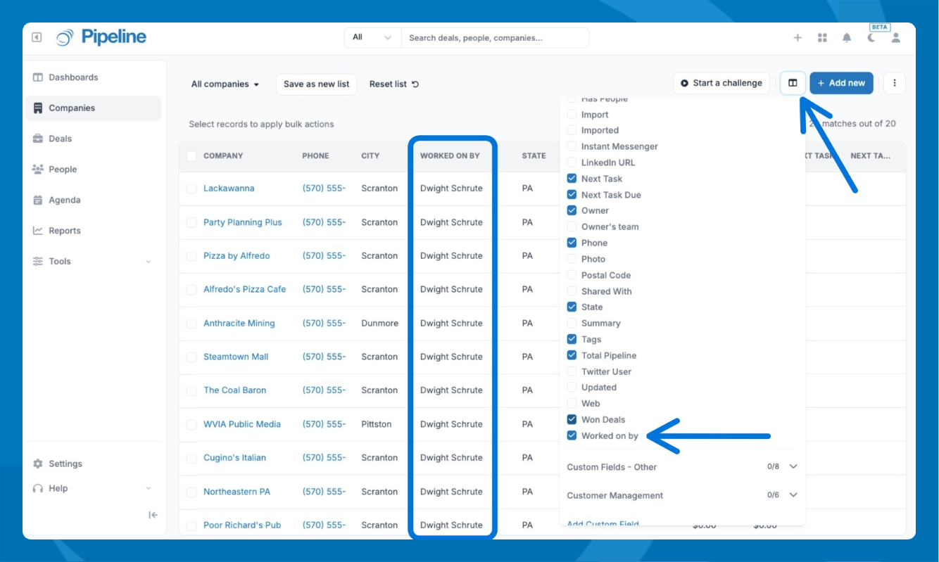 The "Worked on by" column refers to when a user created a company or owns an associated person or deal.