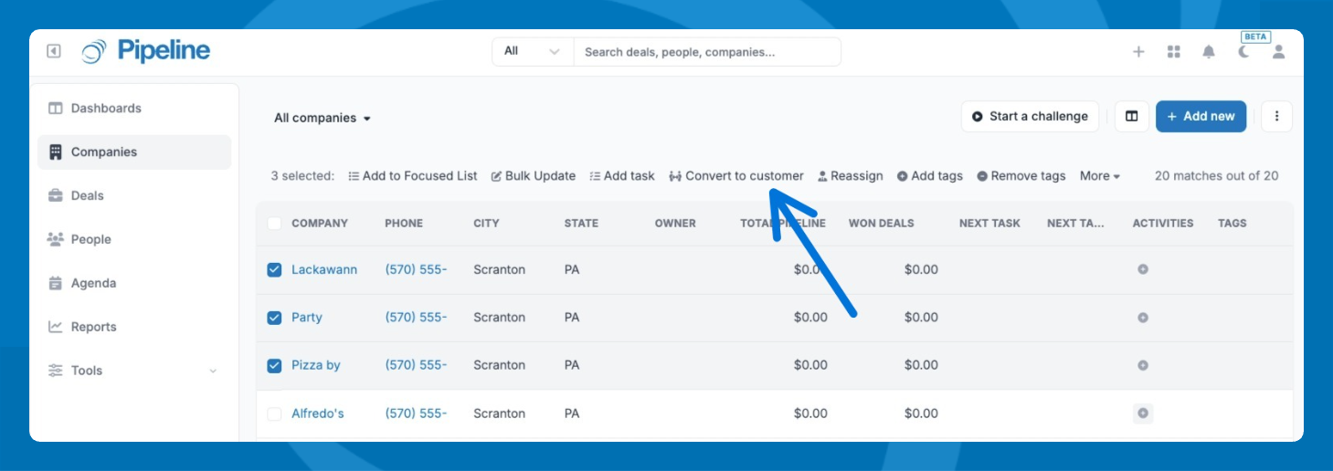 Select multiple companies and convert them to customers in just a few clicks.