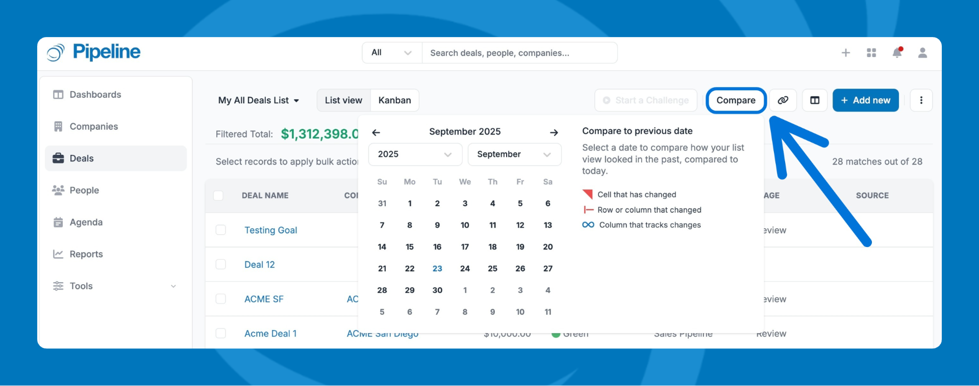 - Green dash: The deal was previously created and is now newly available in the filtered view.