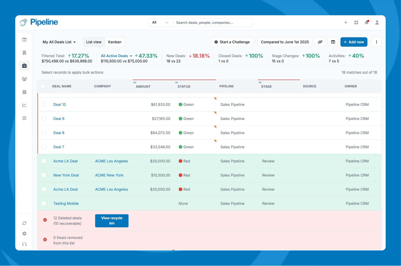 - Deleted vs. Removed: Deleted deals are sent to the Recycle Bin; removed deals are no longer meeting the filter criteria.