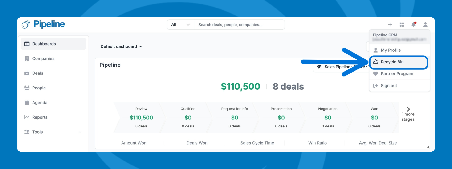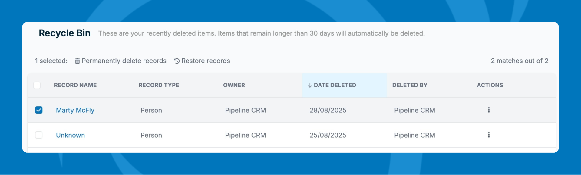 - Restored records will reappear in your CRM, and an activity log will show who restored it and when.