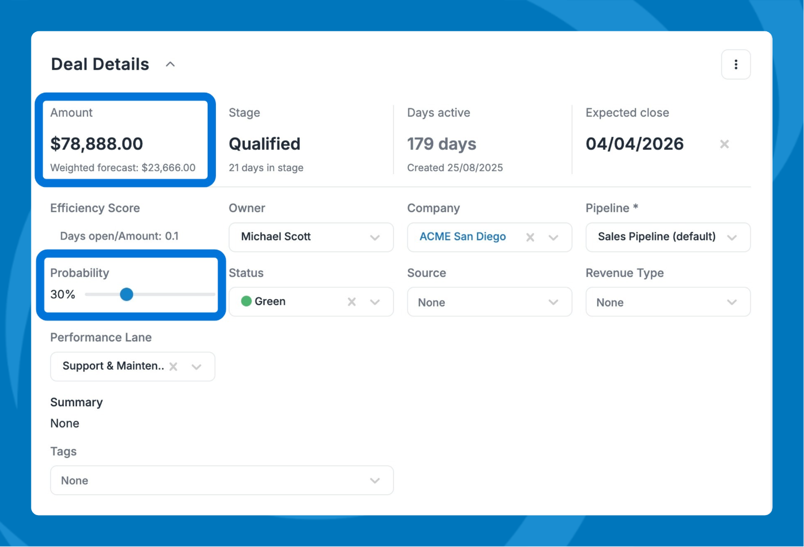 💡 Tip: Keep your Probability % up to date on each deal to ensure your Weighted Forecast reflects an accurate pipeline value.