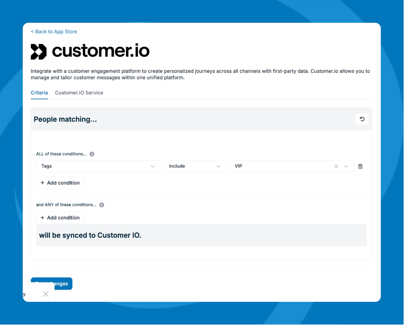 - In the Criteria tab, choose which contacts sync from Pipeline CRM to Customer.io based on tags, custom fields, or other criteria.