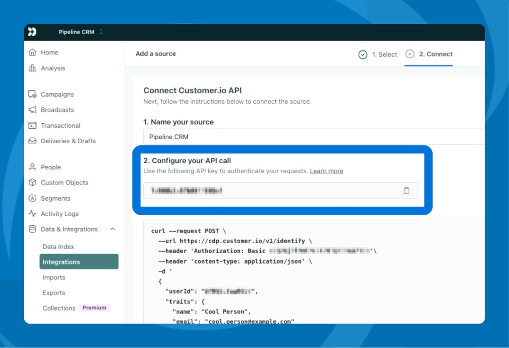 You'll need to create a source in Customer.io to receive data from Pipeline CRM.