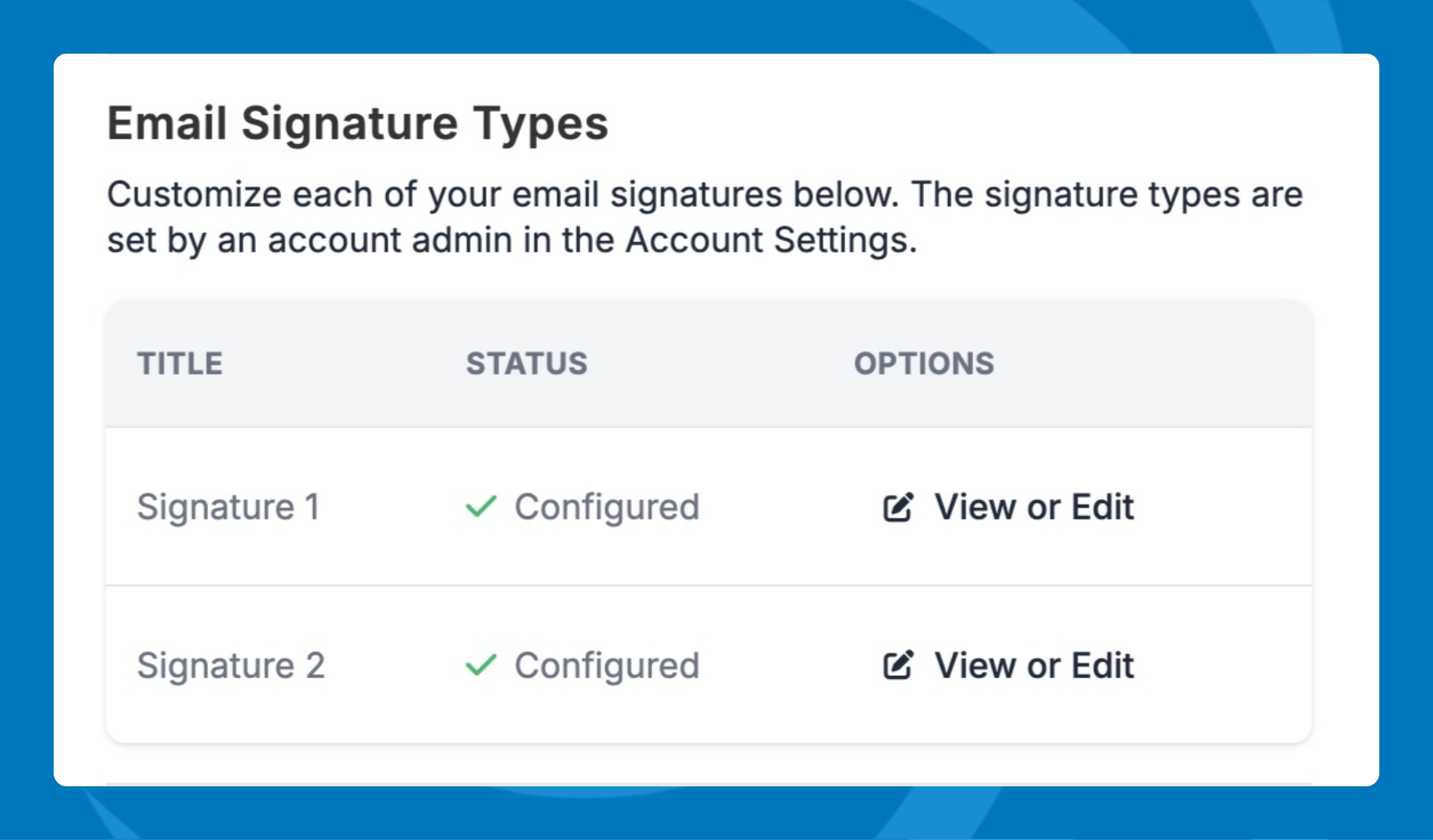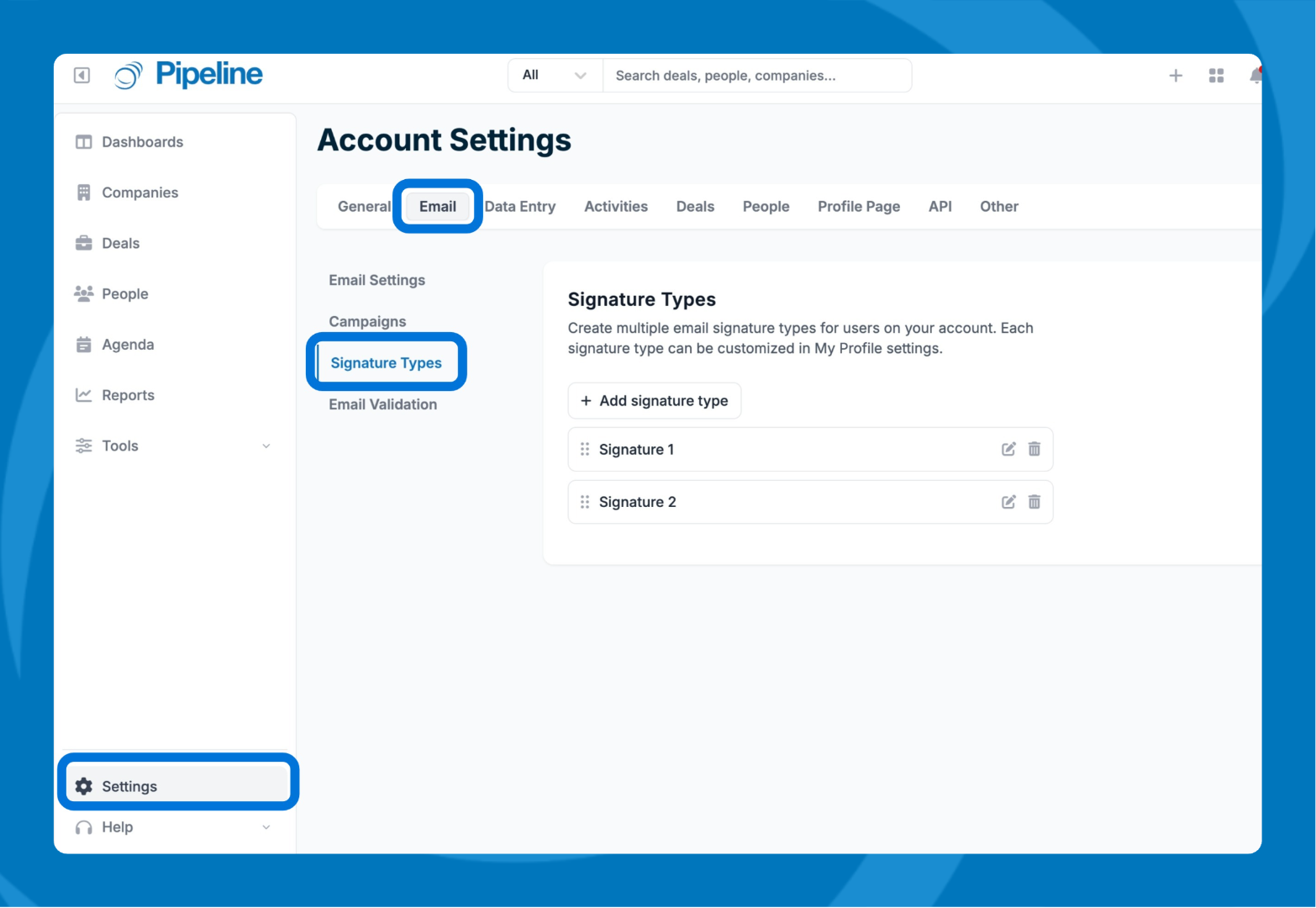You can use Signature Types to set up different email signatures specifically for use in email campaigns. Only an account admin can create Signature Types. To set them up: