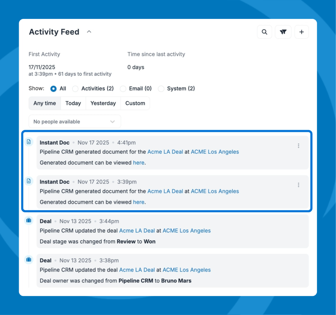 Instant Docs looks for placeholders in your Word file and replaces them with data from Pipeline CRM.