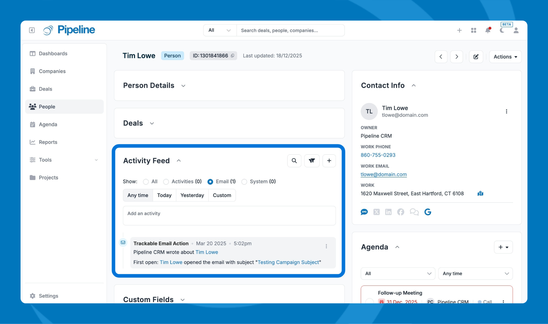 - Activities — shows logged activities (including your custom activity types like calls, voicemails, etc.)