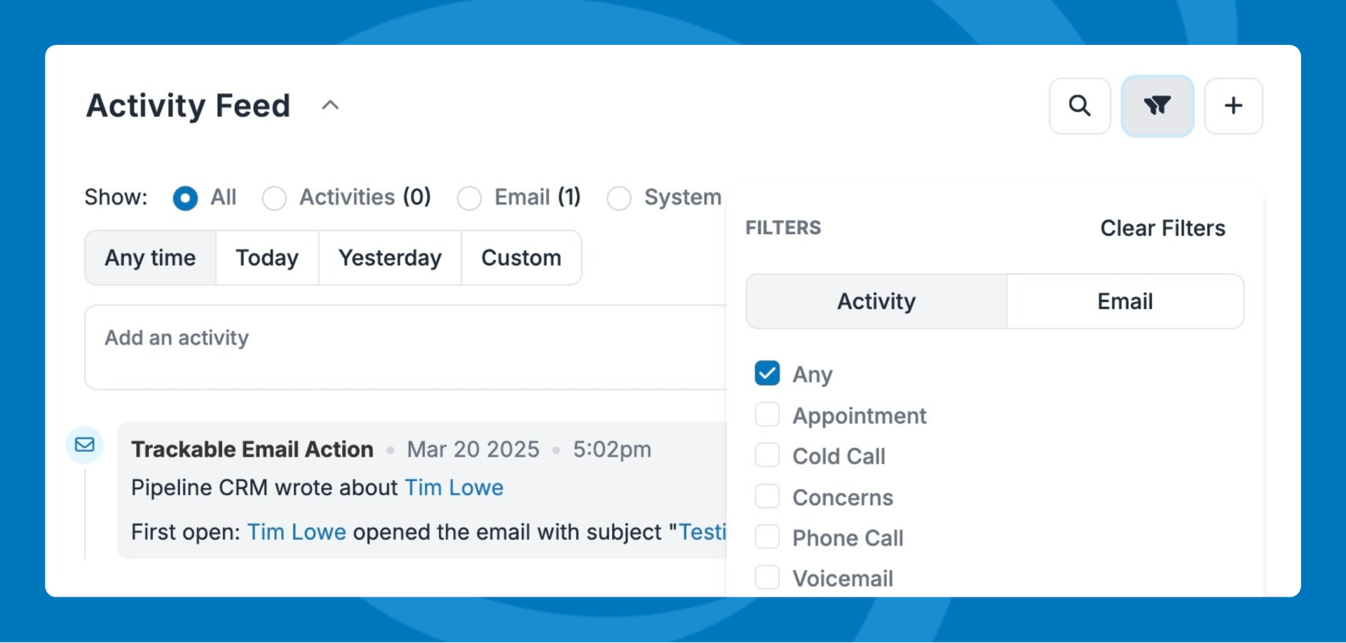 You can also use filters to quickly narrow the feed down to exactly what you need (emails, activities, system updates, and more).