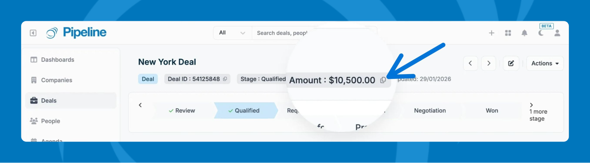 Profile Badge Fields replace the default record ID with meaningful fields on Company, Person, and Deal profiles. Key identifiers—like job numbers, quote IDs, or account codes—always stay visible at the top of the page and can be copied to your clipboard with a single click.